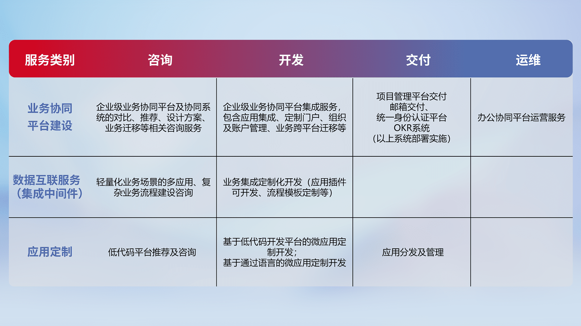 针对钉钉、、、、企微、、IDaas等平台级产品提供产品的规划、、方案、、、、交付、、、定制化开发等服务,,实现如统一协同办公、、、、智能客户服务、、、、混合会议管理、、、智能数据查询、、、等业务场景,,,,实现数字化转型。。。